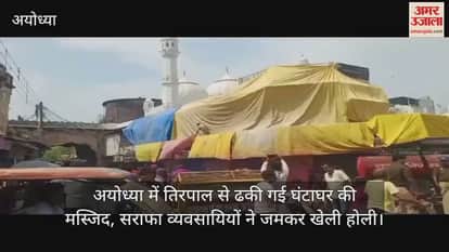 VIDEO : अयोध्या में तिरपाल से ढकी गई घंटाघर की मस्जिद, सराफा व्यवसायियों ने जमकर खेली होली