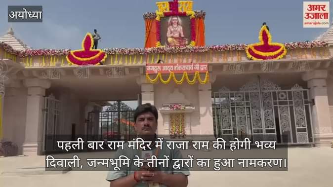 अयोध्या स्थित राम मंदिर में राजा राम की इस बार पहली दिवाली बेहद भव्य होने जा रही है। राम मंदिर के प्रथम तल पर राम दरबार की स्थापना के बाद यह पहली दिवाली है। इस बीच राम मंदिर ट्रस्ट की ओर से श्रीराम जन्मभूमि के तीनों द्वारों का नामकरण कर दिया गया है। एक दिन पहले धनतेरस के मौके पर राम मंदिर के मुख्य प्रवेश द्वार का नामकरण जगद्गुरु रामानंदाचार्य के नाम से हुआ था। इसके बाद दीपोत्सव के मौके पर गेट नंबर-11 (जिसे वीआईपी प्रवेश द्वार के रूप में जाना जाता है) का नामकरण जगद्गुरु आदि शंकराचार्य के नाम पर किया गया है। इसी गेट से प्रधानमंत्री नरेंद्र मोदी, मुख्यमंत्री योगी आदित्यनाथ और अन्य विशिष्ट जन रामलला के दर्शन के लिए जाते हैं। इसी तरह राम मंदिर के गेट नंबर तीन का नामकरण जगद्गुरु मध्वाचार्य के नाम से किया गया है। राम मंदिर के तीनों प्रमुख द्वारों के नामकरण की प्रक्रिया दीपोत्सव के मौके पर पूरी हो गई है। राम मंदिर में दीपोत्सव मनाने की भव्य तैयारी की गई है। मंदिर परिसर की रंग-बिलंगी झालरों से सजावट की गई है। पूरे मंदिर को फूलों से सजाया गया है। सभी द्वारों को भी फूलों से सजाया गया है। राम मंदिर के यह सभी द्वार दीपोत्सव के मौके पर अद्भुत नजारा पेश कर रहे हैं।