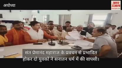 अयोध्या में दो मुस्लिम युवकों ने सनातन धर्म अपनाकर सनातन धर्म में घर वापसी की। अपने नाम बदलकर हिंदू धर्म के अनुसार रख लिए। उन्होंने कहा कि संत प्रेमानंद महाराज के प्रवचन ने उन्हें काफी प्रभावित किया है। इससे उन्होंने हिंदू धर्म अपना लिया।