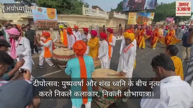 VIDEO : दीपोत्सव: पुष्पवर्षा और शंख ध्वनि के बीच नृत्य करते निकले कलाकार, निकली शोभायात्रा