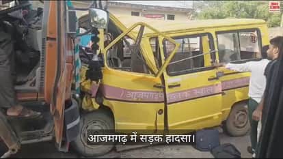 VIDEO : आजमगढ़ में हादसा, ओवरटेक के चक्कर में ट्रेलर से टकराई स्कूली बस, हादसे में चालक व छह बच्चे घायल