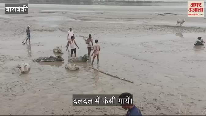 बाराबंकी के सिरौलीगौसपुर तहसील क्षेत्र में सरयू नदी की बाढ़ प्रभावित अलीपुर हुसैनपुर गांव के पास दलदल में कई गाय फंस गई हैं। यह बेजुबान न केवल भूखी हैं बल्कि निकलने का तमाम प्रयास करने के बाद भी नहीं निकल सकीं।