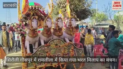 यूपी के बाराबंकी में सिरौली गौसपुर क्षेत्र के पारिजात धाम बरोलिया में रामलीला के दौरान भरत मिलाप का मंचन किया गया। इसमें पहले रथ से भगवान राम लक्ष्मण और सीता जी को नगर भ्रमण कराया गया। इस पर डीजे की धुन पर लोग नाचते गाते हुए इसमें सम्मिलित हुए सम्मिलित हुए।