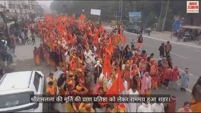 श्रीरामलला की मूर्ति की प्राण प्रतिष्ठा को लेकर बरेली शहर भी राममय हो गया। रविवार को रामलला के अचल विग्रह की प्राण प्रतिष्ठा के उपलक्ष्य में रामदूतों ने बरेली कॉलेज के मैदान से शोभायात्रा निकाली तो शहरवासी इसमें उमड़ पड़े। हर कोई इस ऐतिहासिक पल का साक्षी बनने के लिए आतुर दिखा। बादल और कोहरे की चादर को चीरकर सूर्य चमक उठे, मानो वह भी इस दृश्य को देखने के लिए लालायित हों। रामनामी पटका और हाथों में भगवा ध्वज लिए रामदूतों की टोली सड़कों पर निकली। शोभायात्रा में शामिल बच्चे, बुजुर्ग, युवा और महिलाएं, सभी ने अपने आराध्य के प्रति समर्पण भाव दिखाया। नेताओं से लेकर आमजन तक सभी ने साथ कदमताल किया। राहगीर भी इसमें शामिल हो लिए। हर कोई रामधुन में मग्न दिखा। रामभक्तों का उत्साह कड़ाके की सर्दी को मात दे रहा था। पीतवस्त्र धारी महिलाएं सिर पर कलश लेकर निकलीं तो ऐसा प्रतीत हो रहा था मानो वह अपने आराध्य की अगवानी के लिए जा रहीं हों। एक के पीछे एक रथ पर सजाईं गईं सुंदर झांकियां लोगों का मन मोह रही थीं।