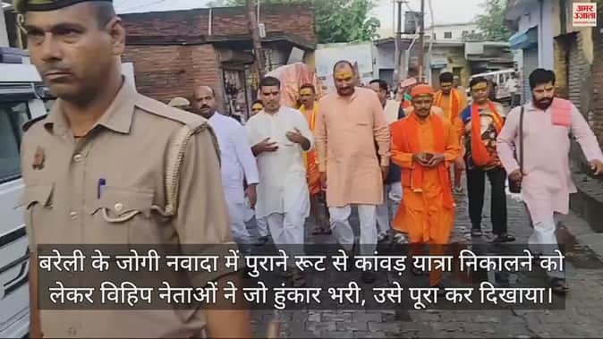 बरेली के जोगी नवादा में पुराने रूट से कांवड़ यात्रा निकालने को लेकर विहिप नेताओं ने जो हुंकार भरी, उसे पूरा कर दिखाया। रविवार सुबह करीब साढ़े आठ बजे विहिप नेताओं के साथ चक महमूद से 11 कांवड़ियों की टोली भजन कीर्तन करती निकली। महंत राकेश कश्यप भी जत्थे के साथ थे। उसी रास्ते से कांवड़ यात्रा निकाली गई जहां पिछली साल बवाल हो गया था। पुलिस प्रशासन इस रूट को अवैध बता रहा था। रविवार को यहां पुलिस बल मौजूद रहा।