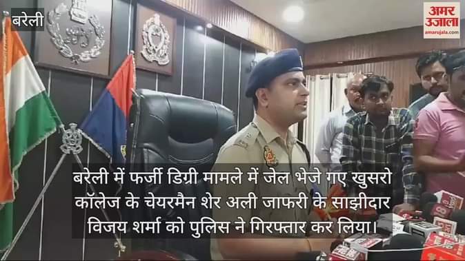 बरेली में फर्जी डिग्री मामले में जेल भेजे गए खुसरो कॉलेज के चेयरमैन शेर अली जाफरी के साझीदार विजय शर्मा को पुलिस ने गिरफ्तार कर लिया। विजय पर 25 हजार रुपये का इनाम घोषित था। एसपी सिटी मानुष पारीक ने बुधवार को प्रेसवार्ता कर विजय शर्मा की गिरफ्तारी के संबंध में जानकारी दी। एसपी सिटी ने बताया कि फर्जी डिग्री प्रकरण में अब तक तीन आरोपियों को गिरफ्तार किया जा चुका है। इनमें शेर अली जाफरी, उसके बेटे फिरोज को पहले ही जेल भेजा जा चुका है। इस प्रकरण में मुख्य अभियुक्त विजय शर्मा को भी गिरफ्तार कर लिया गया। उसे भी जेल भेजा जाएगा।