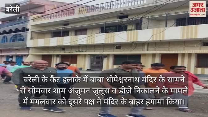 बरेली के कैंट इलाके में बाबा धोपेश्वरनाथ मंदिर के सामने से सोमवार शाम अंजुमन जुलूस व डीजे निकालने के मामले में मंगलवार को दूसरे पक्ष ने मंदिर के बाहर हंगामा किया। पुलिस ने दोनों पक्षों को थाने बुला लिया। वहां पंचायत के बाद दोनों पक्षों में सहमति बन गई। अब मंदिर के सामने से कभी अंजुमन जुलूस व डीजे नहीं जाएगा। थाने के इंस्पेक्टर ने दोनों पक्षों को समझाकर लिखित में फैसला करा दिया।