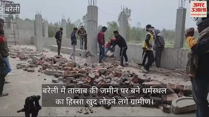 VIDEO : बरेली में तालाब की जमीन पर बने धर्मस्थल का हिस्सा खुद तोड़ने लगे ग्रामीण