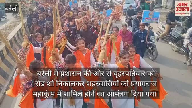 बरेली में प्रशासन की ओर से बृहस्पतिवार को रोड शो निकालकर शहरवासियों को प्रयागराज महाकुंभ में शामिल होने का आमंत्रण दिया गया। भगवान शिव, देवी पार्वती, भारत माता, गंगा, यमुना, सरस्वती की झांकियां आकर्षण का केंद्र रहीं। कई बेटियां शिव के स्वरूप में दिखीं। देशभक्ति और शिवभक्ति का संदेश गूंजा। झांकियों का जगह-जगह स्वागत किया गया। विश्व के सबसे बड़े सांस्कृतिक समागम प्रयागराज महाकुंभ-2025 के प्रचार-प्रसार और अधिक भागीदारी सुनिश्चित कराने के लिए त्रिवटीनाथ मंदिर से बैंडबाजे के साथ रोड शो निकाला गया। जिला पंचायत अध्यक्ष रश्मि पटेल, विधायक डॉ. राघवेंद्र शर्मा, एमपी आर्य, डीएम रविंद्र कुमार एवं सीडीओ जगप्रवेश ने इसका शुभारंभ किया। रास्तेभर हर-हर महादेव, महाकुंभ चलो की गूंज होती रही। इस दौरान विद्यार्थियों ने समुद्र मंथन की प्रस्तुति दी। साहू गोपीनाथ इंटर कॉलेज की छात्रा खुशी और राजकीय इंटर कॉलेज की शिवानी शिव के स्वरूप में आईं। इस्लामिया इंटर कॉलेज की छात्रा तमन्ना भारत माता के स्वरूप में दिखीं। बेटियों ने देशभक्ति के तरानों पर नृत्य किया। प्रेमनगर चौराहे से जनकपुरी, डीडीपुरम, एकतानगर होते हुए आदिनाथ चौराहे पर रोड शो समाप्त हुआ। यहां डमरू के संग फोटो खिंचवाने की होड़ रही।