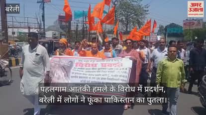 जम्मू-कश्मीर के पहलगाम में हुए आतंकी हमले के बाद देशवासियों में आक्रोश है। लोग सड़कों पर उतरकर आतंकवाद के खिलाफ प्रदर्शन कर रहे हैं। बरेली में भी नाथनगरी सुरक्षा समूह की ओर से विरोध प्रदर्शन किया गया। बुधवार को सेठ दामोदरदास पार्क में पहुंचे कार्यकर्ताओं ने पाकिस्तान के विरोध में नारेबाजी की जिलाधिकारी कार्यालय पहुंचे। जिलाधिकारी कार्यालय पर पाकिस्तान के विरोध में जमकर नारेबाजी की गई और पुतला फूंका गया। प्रधानमंत्री नरेंद्र मोदी के नाम सिटी मजिस्ट्रेट राजीव शुक्ला को ज्ञापन सौंपा। संगठन के महामंत्री दुर्गेश गुप्ता ने कहा कि आतंकवादियों की हरकत बेहद कायरना है। निर्दोष लोगों के धर्म पूछ कर निशाना बनाया गया है। केंद्र सरकार को जल्द ही इस पर कार्रवाई करनी चाहिए।