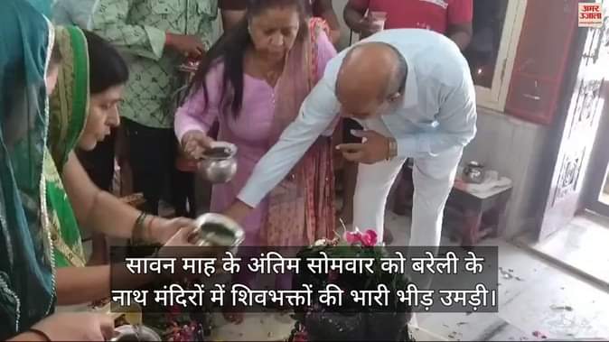 सावन माह के अंतिम सोमवार को बरेली के नाथ मंदिरों में शिवभक्तों की भारी भीड़ उमड़ी। तड़के चार बजे से ही मंदिरों के बाहर भक्तों की कतारें लग गई। कांवड़ियों ने गंगाजल से भगवान शिव का जलाभिषेक किया। जलाभिषेक का सिलसिला दोपहर तक जारी रहा। शहर के तमाम रास्तों पर शिव भक्त कांवड़ लिए भगवा वस्त्र में नजर आए।