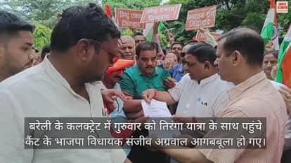 विधायक ने दरोगा से कहा, निगाह नीचे कर..., पीछे हट। ज्ञापन ले रहे सिटी मजिस्ट्रेट ने विधायक को शांत कराया। दरअसल, भाजपा कार्यकर्ताओं के साथ कैंट के भाजपा विधायक संजीव अग्रवाल बांग्लादेश में हिंदुओं पर हो रहे अत्याचार के विरोध में ज्ञापन देने पहुंचे थे। भाजपा कार्यकर्ता के हाथों में तिरंगा झंडा था। ज्ञापन देने के दौरान विधायक और कार्यकर्ता फोटो खिंचवा रहे थे, तभी एक कार्यकर्ता का तिरंगा जमीन से छू गया। यह देख वहां मौजूद एक दरोगा ने उस कार्यकर्ता को टोकते हुए तिरंगा ऊंचा करने को कहा। इतना सुनते ही भाजपा विधायक आगबबूला हो गए। उन्होंने गुस्सा जताते हुए दरोगा को फटकार लगा दी।