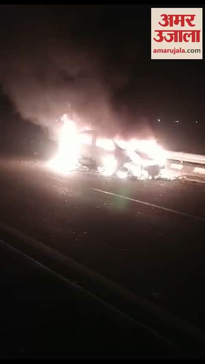 VIDEO : दिल्ली-लखनऊ हाईवे पर चलती कार में लगी आग, ग्रामीणों ने बचाई तीन लोगों की जान