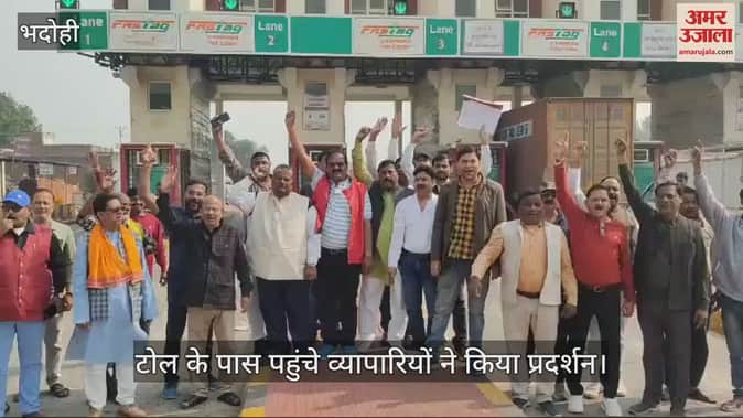 VIDEO : भदोही के लालानगर टोल के पास व्यापारियों का प्रदर्शन, टोल प्लाजा बंद करने की मांग
