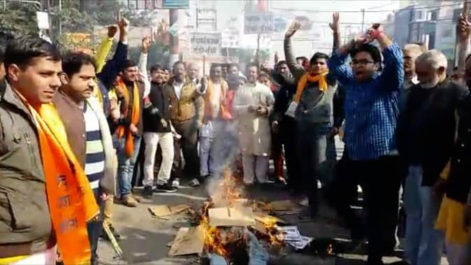 बिजनौर में फिल्म ‘पद्मावत’ की रिलीज को लेकर करणी सेना के कार्यकर्ता सड़कों पर उतर आए। करणी सेना के कार्यकर्ताओं ने 'पद्मावत' के विरोध में फिल्म के डायरेक्टर संजय लीला भंसाली का पुतला फूंका। साथ ही कलेक्ट्रेट ऑफिस में एसडीएम को ज्ञापन सौंपकर फिल्म को प्रदर्शित न करने की बात कहीं।