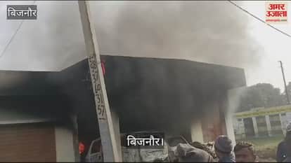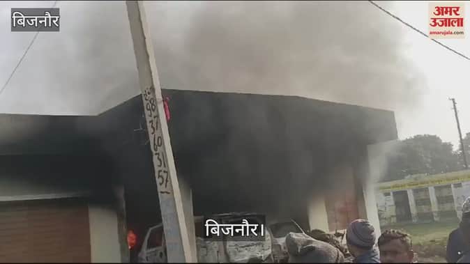 VIDEO : बिजनाैर के नूरपुर में शार्ट सर्किट होने से पंचायत घर में लगी भीषण आग, दो कार जलकर राख