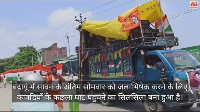बदायूं में सावन के अंतिम सोमवार को जलाभिषेक करने के लिए कांवड़ियों के कछला घाट पहुंचने का सिलसिला बना हुआ है। मंगलवार दोपहर शाहजहांपुर जिले के मदनापुर क्षेत्र के कांवड़िये देशभक्ति के रंग में सराबोर होकर कछला घाट पर पहुंचे। 101 फीट लंबे तिरंगे के साथ उन्होंने कछला घाट से गंगाजल लेकर कांवड़ यात्रा शुरू की तो देखने वालों की भीड़ लग गई। कांवड़ियों ने बताया कि वे लोग 15 अगस्त को मदनापुर के शिव मंदिर में जलाभिषेक करेंगे। मंदिर तक वे पैदल ही पहुंचेंगे। तिरंगा कांवड़ यात्रा रास्ते में लोगों का आकर्षण बनी रही।