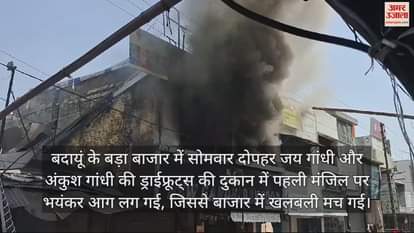 VIDEO : बदायूं में ड्राईफ्रूट्स की दुकान में लगी भीषण आग, बाजार में मची खलबली