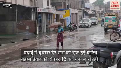 बदायूं में बुधवार देर शाम को शुरू हुई बारिश बृहस्पतिवार को दोपहर 12 बजे तक जारी रही। झमाझम बारिश ने शहर को तर-बतर कर दिया। बुधवार रात 12 बजे से दो बजे तक जमकर बारिश हुई। तेज बारिश से शहर के नाले उफना गए। कई निचले इलाकों में लोगों के घरों में भी पानी घुस गया। यहीं हाल देहात क्षेत्र का है। मौसम विभाग ने अगले दो दिनों में भारी बारिश की संभावना जताई है।