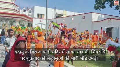 बदायूं के बिरूआबाड़ी मंदिर में सावन माह की शिवरात्रि पर शुक्रवार को श्रद्धालुओं की भारी भीड़ उमड़ी। हर-हर महादेव के जयकारे के बीच कांवड़ियों ने भगवान शिव का जलाभिषेक किया। शिवभक्तों के जयघोष से पूरा क्षेत्र भक्तिमय हो गया।