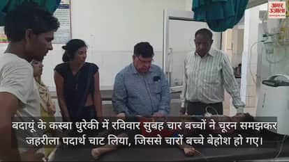 बदायूं के कस्बा धुरेकी में रविवार सुबह चार बच्चों ने चूरन समझकर जहरीला पदार्थ चाट लिया, जिससे चारों बच्चे बेहोश हो गए। उन्हें तुरंत नजदीकी सामुदायिक स्वास्थ्य केंद्र ले जाया गया, जहां से जिला अस्पताल में भेज दिया गया। धुरेकी निवासी राकेश के घर में रविवार दोपहर कुठिया से गेहूं निकाले गए थे। उन गेहूं में घुन मारने वाली जहरीली दवा की पुड़िया पड़ी थी। उस दौरान पड़ोसी सईद अहमद का बेटा जैद (4), बेटी अनाविया (2), संध्या (3) पुत्री राकेश और उसकी भाई रामा (2) वहीं खेल रहे थे। गेहूं निकालने के दौरान उनके हाथ में जहरीले पदार्थ की पुड़िया आ गई। बच्चे उसे खेल-खेल में उठा ले गए और उन्होंने चूरन समझ कर चाट लिया। जब कुछ देर बाद उनकी हालत बिगड़ी। परिवार वाले उन्हें देखकर हैरान रह गए। वह सभी बच्चों को तुरंत सामुदायिक स्वास्थ्य केंद्र ले गए। जहां से उन्हें जिला अस्पताल रेफर कर दिया गया है। सभी बच्चों की हालत खतरे से बाहर बताई गई है।
