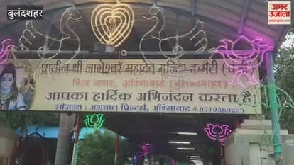 बुलंदशहर के औरंगाबाद में प्राचीन श्री नागेश्वर महादेव मंदिर पर जलाभिषेक करते श्रद्धालु