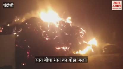 चंदौली में आग की चपेट में आने से सात बीघा धान का बोझ जला, VIDEO
