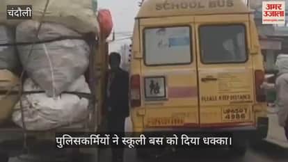 चंदौली में चौराहे पर खराब हुई स्कूली बस, पुलिसकर्मियों ने धक्का देकर कराया स्टार्ट