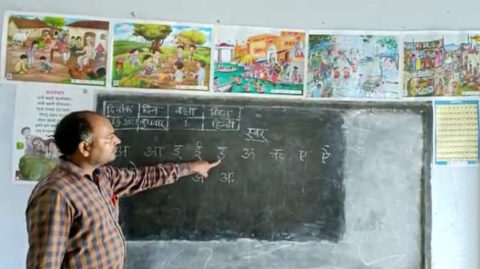 Deoria: बच्चों को गीत के माध्यम से वर्णमाला समझा रहे गुरु जी