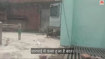 VIDEO : एटा के मारहरा में चार दिन से चारपाई में फंसा हुआ है बंदर, निकालने की हिम्मत नहीं जुटा पा रहे लोग