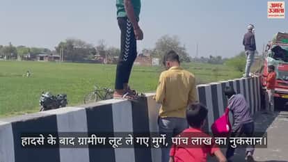 नेशनल हाईवे पर मुर्गों से भरी डीसीएम का पिछला टायर अचानक फट गया। इससे वह अनियंत्रित होकर पलट गया। हादसे के बाद मृत व जिंदा मुर्गे ग्रामीण व राहगीर उठाकर ले गए। लग्जरी कार से भी उतरकर लोग मुर्गे उठा ले गए। इसमें लगभग पांच लाख का नुकसान बताया गया है।