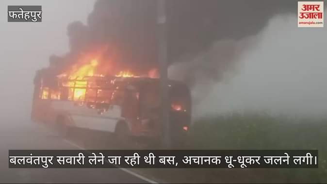 VIDEO : फतेहपुर में बीच सड़क में बस धू-धूकर जली, सवारी लेने जा रही थी बलवंतपुर, फायर ब्रिगेड और पुलिस मौके पर