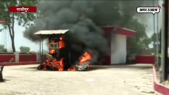 गाजीपुर में पेट्रोल पंप पर लगी आग, दो बाइक जलकर खाक