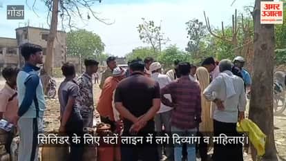गोंडा में सिलिंडर के लिए घंटों लाइन में लगे दिव्यांग व महिलाएं