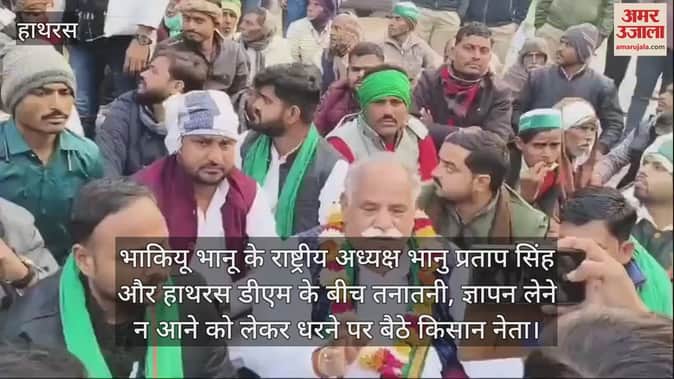 VIDEO : भाकियू भानू के राष्ट्रीय अध्यक्ष भानु प्रताप सिंह और हाथरस डीएम के बीच तनातनी, ज्ञापन लेने न आने काे लेकर धरने पर बैठे किसान नेता