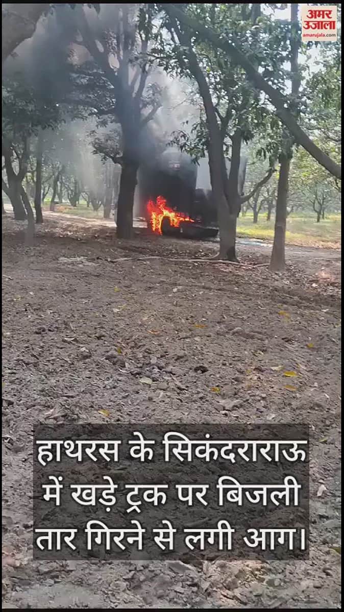 VIDEO : हाथरस के सिकंदराराऊ में खड़े ट्रक पर बिजली तार गिरने से लगी आग