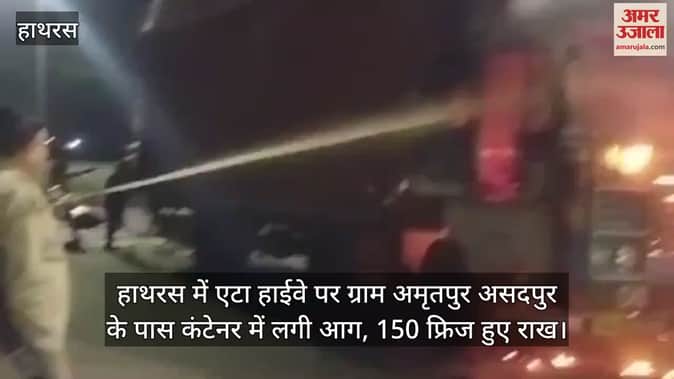 हाथरस में एटा हाईवे पर ग्राम अमृतपुर असदपुर के पास कंटेनर में लगी आग, 150 फ्रिज हुए राख