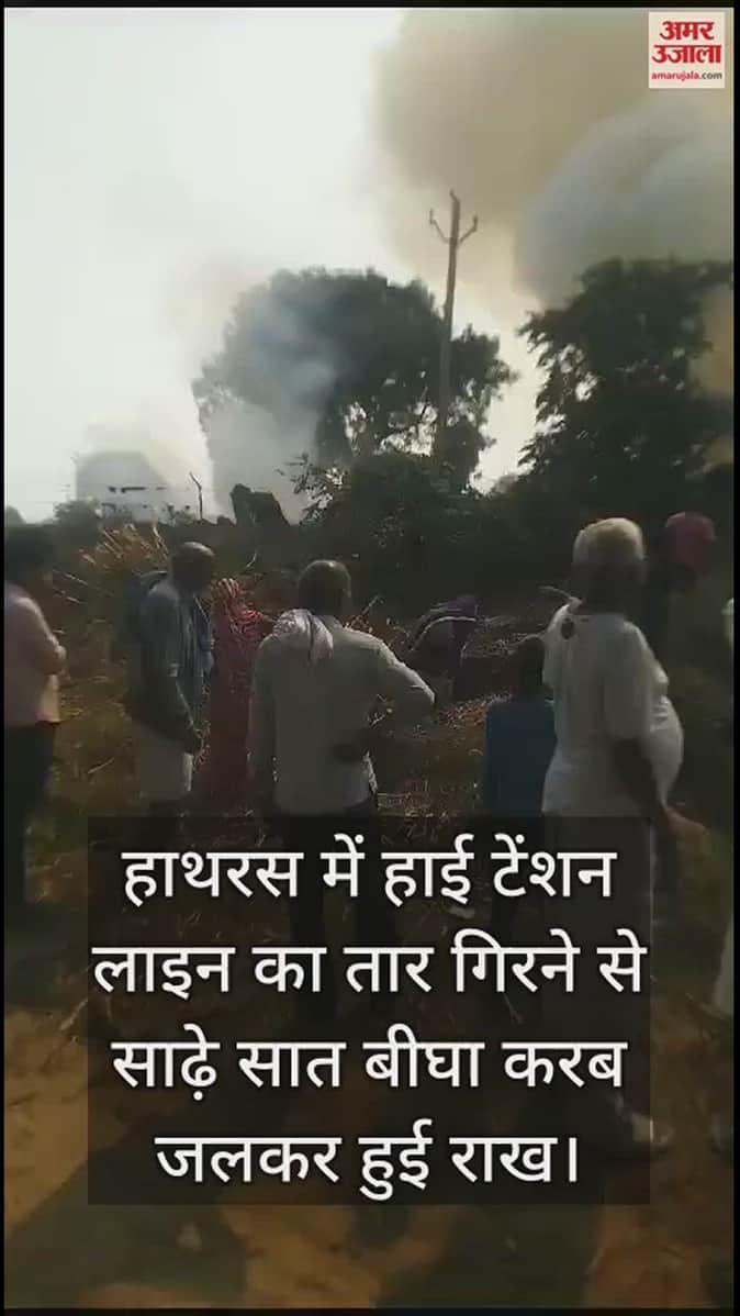 VIDEO : हाथरस में हाई टेंशन लाइन का तार गिरने से साढ़े सात बीघा करब जलकर हुई राख