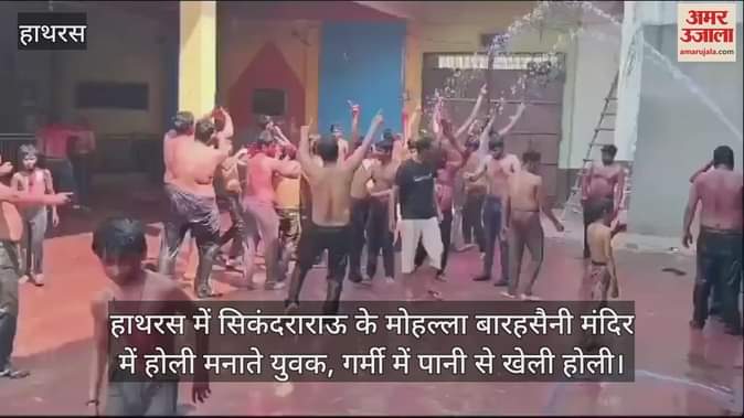 VIDEO : हाथरस में सिकंदराराऊ के मोहल्ला बारहसैनी मंदिर में होली मनाते युवक, गर्मी में पानी से खेली होली