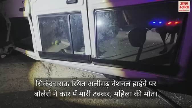 VIDEO : सिकंदराराऊ स्थित अलीगढ़ नेशनल हाईवे पर बोलेरो ने कार में मारी टक्कर, महिला की मौत