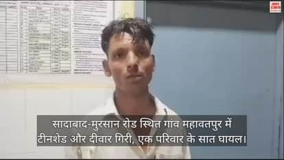 VIDEO : सादाबाद-मुरसान रोड स्थित गांव महावतपुर में टीनशेड और दीवार गिरी, एक परिवार के सात घायल