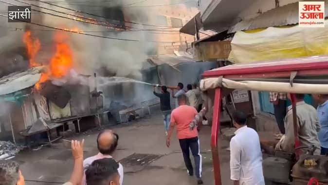 A massive fire in Mauranipur gutted three shops, leaving the fire brigade scrambling to extinguish the fire.