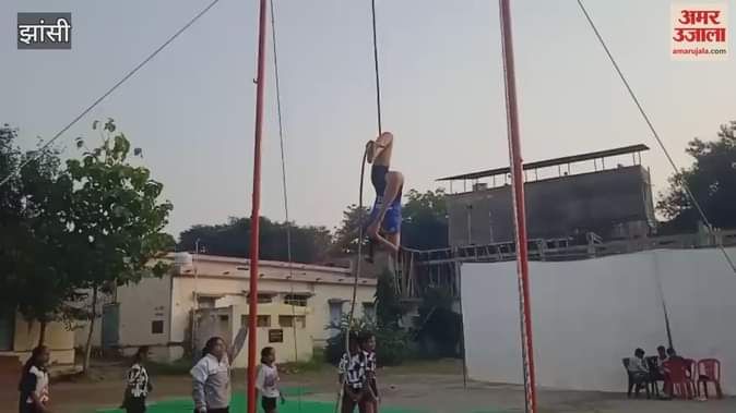 झांसी: मल्लखंभ प्रतियोगिता में करतब दिखाते खिलाड़ी