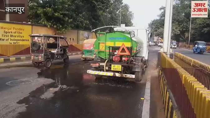 बढे़ वायु प्रदूषण के चलते माल रोड फूलबाग पर मशीन से किया गया पानी का छिड़काव