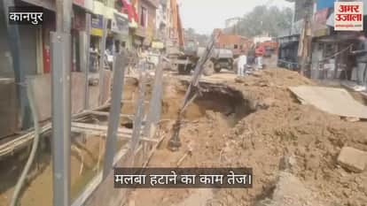कानपुर: ब्रह्म नगर में धंसे नाले की सफाई शुरू, मंगलवार को जेसीबी लेकर पहुंची नगर निगम की टीम