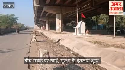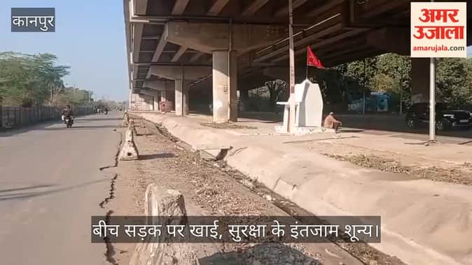 कानपुर: फ्लाईओवर के नीचे दो लेनों के बीच बना ड्रेनेज; बिना बैरिकेडिंग के मौत को दावत दे रहा एनएचएआई का डिजाइन