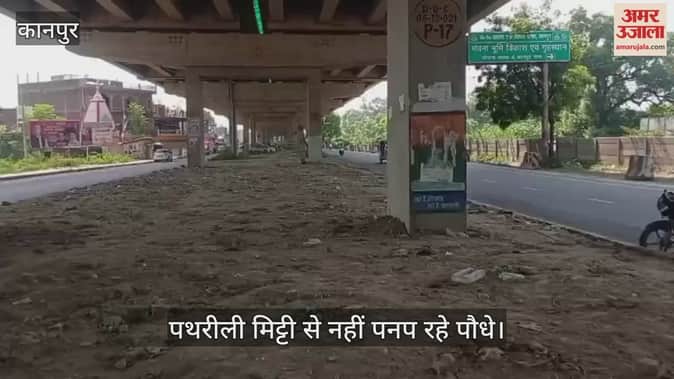 कानपुर: जीटी रोड पर ग्रीन बेल्ट गायब, मंधना फ्लाईओवर के नीचे पथरीली मिट्टी से सूख गए पौधे