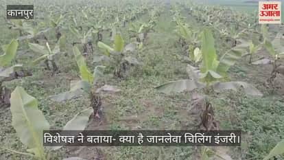 भीतरगांव में तापमान पांच डिग्री सेल्सियस से नीचे जाने के कारण केले की फसल चिलिंग इंजरी का शिकार हो रही है। कोशिकाओं के अंदर पानी जमने और फटने से पत्ते काले होकर सूख रहे हैं, जिससे भारी नुकसान की आशंका है।