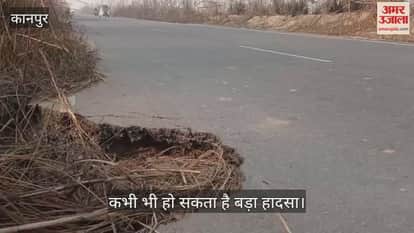 कानपुर: किसान नगर मार्ग पर सीढ़ी गांव के पास धंसी सड़क, हजारों वाहनों के लिए बना जानलेवा जाल