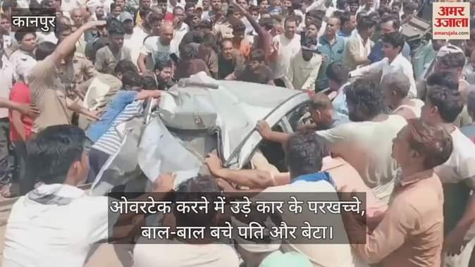 कानपुर के घाटमपुर कस्बे में शुक्रवार सुबह हमीरपुर से कानपुर जाने के दौरान शुक्ला पेट्रोल पंप के पास ओवरटेक करने के दौरान अनियंत्रित हुई कार आगे जा रहे ट्रक में जा घुसी। तभी पीछे से आ रहा ट्रक भी कार में जा घुसा। हादसे में कार के आगे व पीछे से परखच्चे उड़ गए। कार में आगे बैठी महिला, जहां काफी देर तक सीटों के बीच में फंसी रही। वहीं साथ में जा रहे पति व कार चला रहा बेटा बाल-बाल बच गए। दोनों लोगों को किसी तरह बाहर निकाला गया। सूचना पर पहुंची पुलिस ने लोगों की मदद से किसी तरह फंसी महिला को बाहर निकाला।